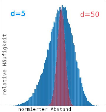 Genauer gesagt liegen die Datenpunkte in einem Histogramm der Entfernungen immer enger gedrängt. Die Unterscheidung, ob sich Datenpunkte wirklich ähnlich sind oder nur aufgrund ihrer „Drängung“ nah beieinanderliegen, geht im Rauschen unter. In der Grafik links sind qualitativ die Verteilungen der normierten Abstände bei 5 Dimensionen gegen die Abstände bei 50 Dimensionen dargestellt. In der Praxis kommen Datenmodelle mit Hunderten oder gar Tausenden von Dimensionen vor. Die Grafiken sind einem umfangreicheren Vortrag von DD1AH über dieses Themengebiet entnommen.