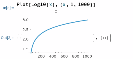 Grafisch sieht das dann so aus, dass der Graph des Logarithmus für größere Zahlen immer flacher wird. Das können wir uns auf dem Raspi mit Mathematica anzeigen lassen.